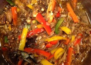 2 berinjelas grandes | 1 ½ xícara (chá) de azeite de oliva | 1 pimentão vermelho | 1 pimentão verde | 1 pimentão amarelo | 3 dentes de alho | 2 folhas de louro | 3 colheres (sopa) de azeitona preta picada | 2 cebolas | 2 colheres (sopa) de orégano | Pimenta calabresa em flocos a gosto | Sal a gosto