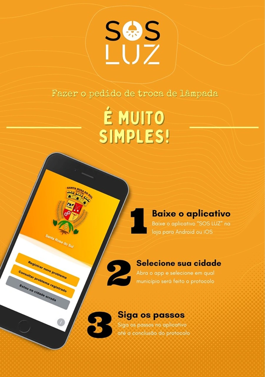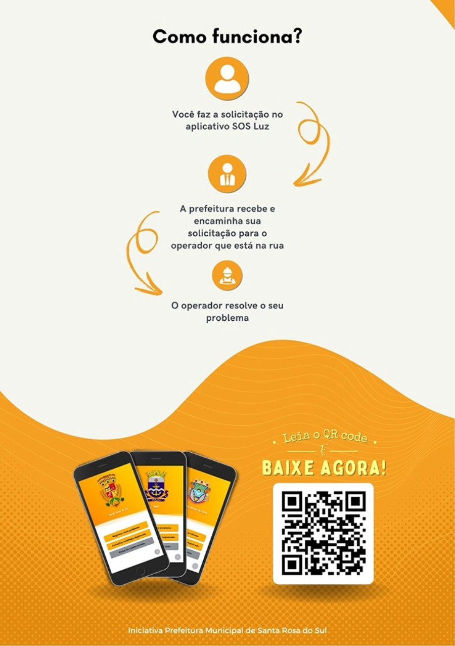 Agora, os cidadãos de Santa Rosa do Sul contam com o SOS LUZ, um aplicativo que torna mais fácil o acionamento da equipe responsável pela iluminação pública. Com ele, é possível registrar solicitações como troca de lâmpadas e outros reparos diretamente pelo celular!
