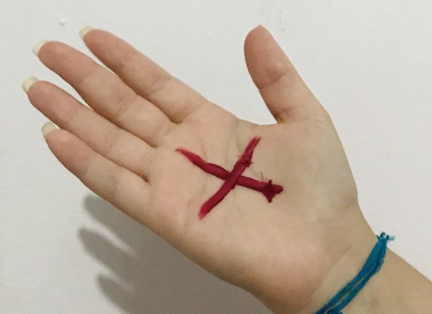 - O sinal “X” feito com batom vermelho (ou qualquer outro material) na palma da mão ou em um pedaço de papel, o que for mais fácil, permitirá que o farmacêutico ou o atendente das farmácias e drogarias previamente cadastradas reconheça que aquela mulher foi vítima de violência doméstica e, assim, promova o acionamento da Polícia Militar.