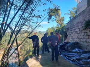 Utilizando uma mangueira de combate a incêndio, eles despejaram jatos d’água com pressão na parte superior do morro, a fim de remover o excesso de materiais soltos e realizar a prevenção de novos deslizamentos.