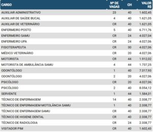 Conforme o município, há oportunidades para servente, motorista de ambulância, técnicos em enfermagem, enfermeiros, dentistas, psicólogos, entre outras funções. As inscrições são gratuitas e devem ser feitas presencialmente entre quarta-feira (26) e sexta-feira (28), na Secretaria Municipal de Administração/RH, localizada no 3º andar da Prefeitura, na Avenida da Igreja, 346. O atendimento ocorre das 13h às 17h30.