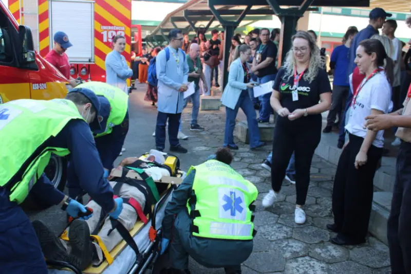 Durante o exercício, a equipe de segurança da Unesc coordenou o trânsito, garantindo que as ambulâncias e o caminhão de bombeiros chegassem rapidamente aos locais necessários. Os brigadistas voluntários auxiliaram na evacuação, sinalizando áreas de risco e prestando suporte a eventuais vítimas.