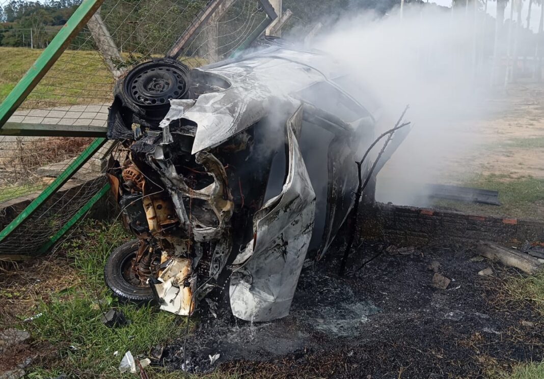 Na tarde de sexta-feira (14), por volta das 12h39, um veículo foi completamente destruído por um incêndio após colidir contra um muro de alvenaria na Estrada Geral do bairro São Peregrino, em Turvo. A guarnição do Corpo de Bombeiros foi acionada para atender a ocorrência, classificada como incêndio veicular.